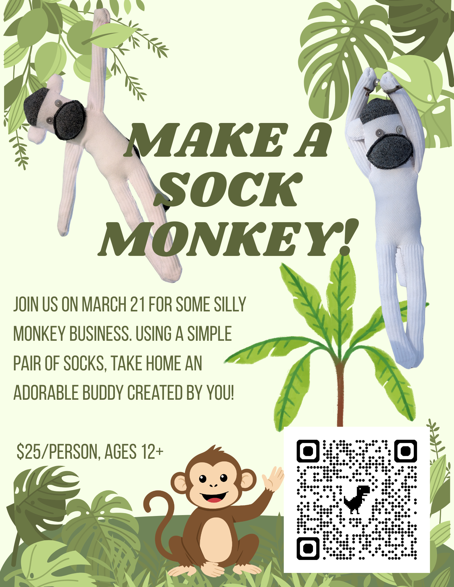 Join us for an evening of monkeying around and make your own sock monkey. Everything is supplied in this workshop, so just bring your enthusiasm and creativity. Ages 12+, $16/person